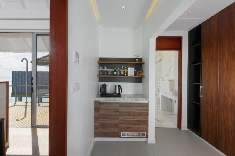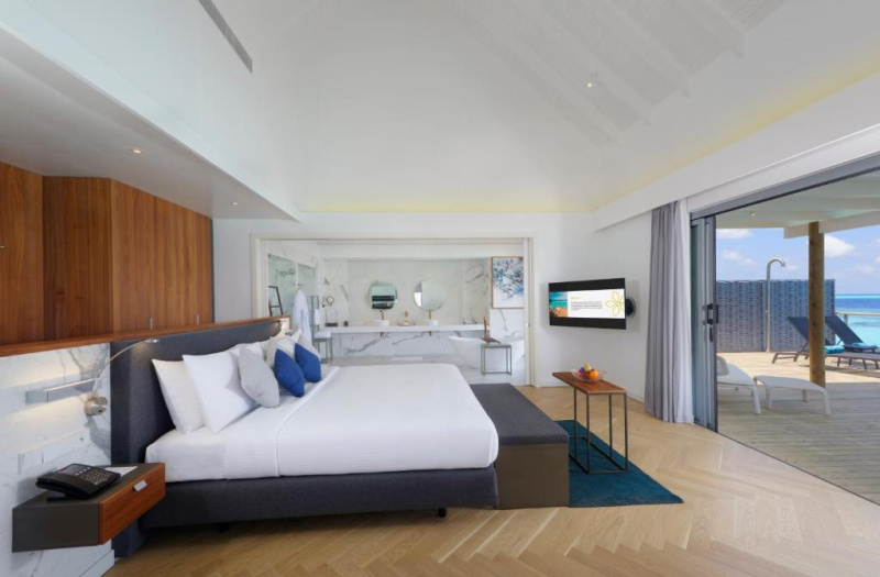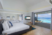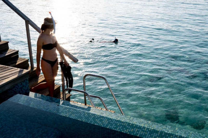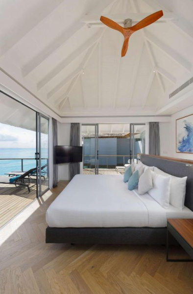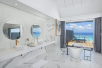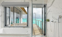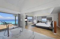 Velkorysá nadvodní vila s privátním bazénem, oddělenou koupelnou s volně stojící vanou, velká terasa se schůdky do oceánu.