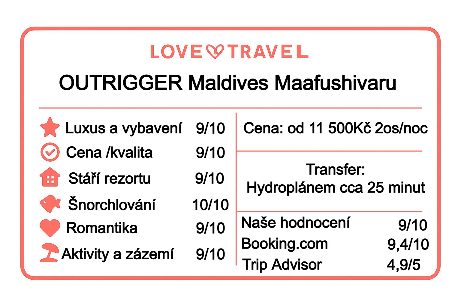Perfektní volba pro páry i rodiny, kteří chtějí menší komorní ostrov (cca 350 m) s výborným šnorchlováním a bezvadnou kuchyní. Silné stránky: romantika, gastronomie a přístup k aktivitám v South Ari (manty, žraloci obrovští). Slabší stránkou je povinný hydroplán (jen ve dne).