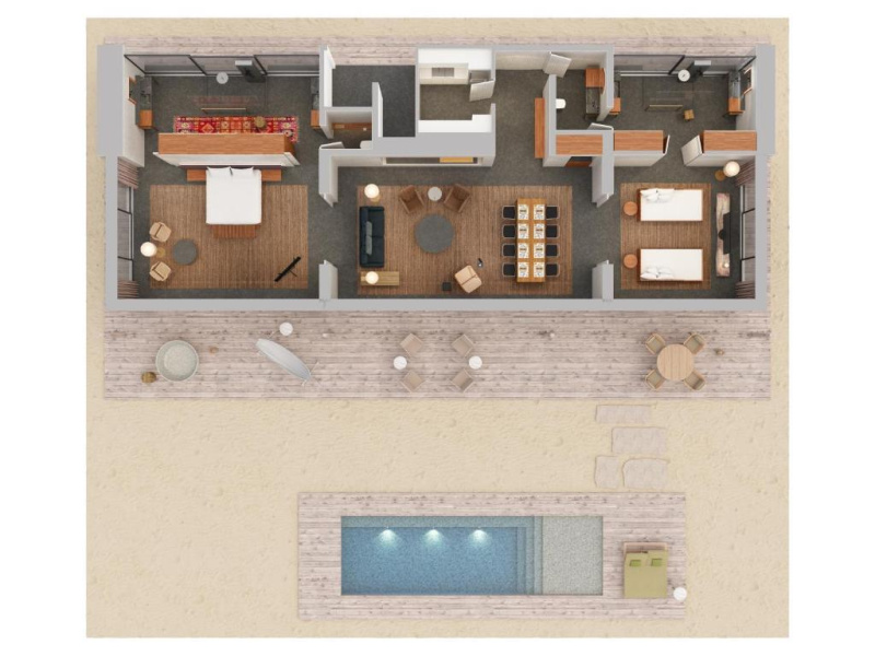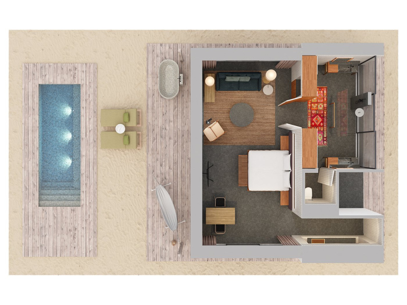 Stejná dispozice jako Water Pool Villa, ale orientovaná na západ slunce pro jedinečný večerní výhled.