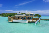 Luxusní vodní vila se skluzavkou, umístěná nad oceánem a přístupná po zakřiveném molu. Nabízí dechberoucí výhledy, prostorný interiér s přirozeným světlem, obývací část, minibar a spižírnu. Stylový interiér v přírodním tónu podtrhuje atmosféru absolutního klidu a soukromí.