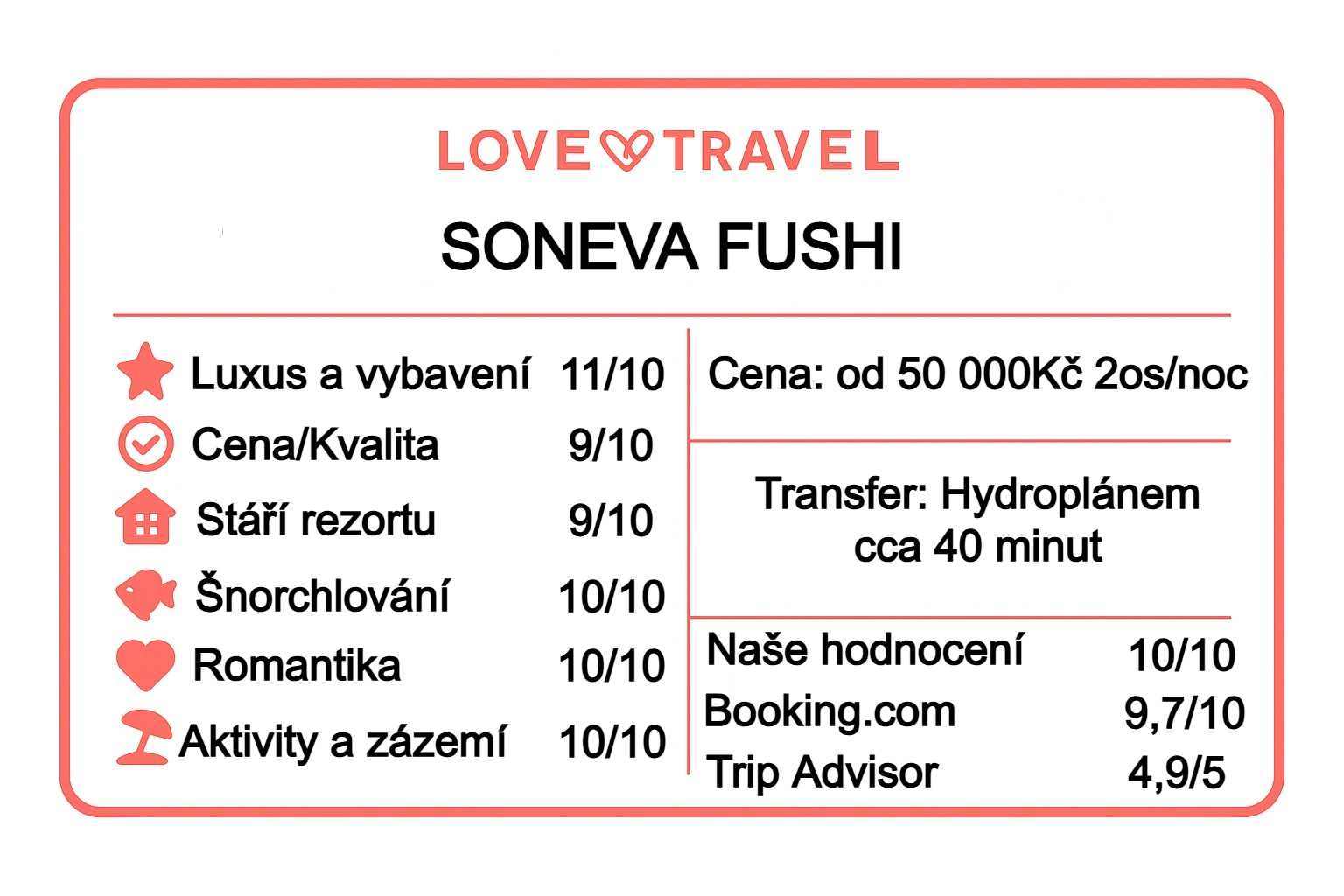 - Doprava: hydroplán cca 30–45 min z letiště v Malé