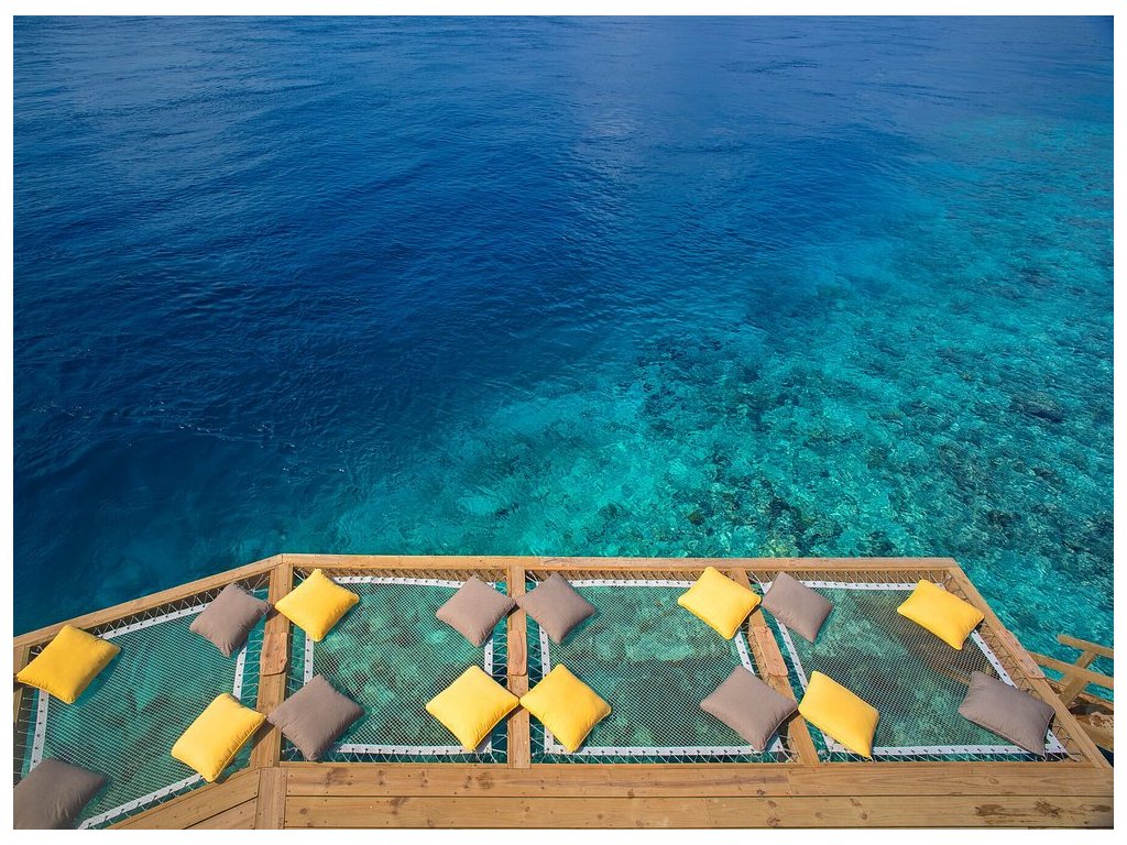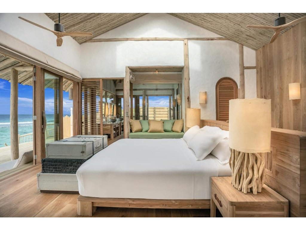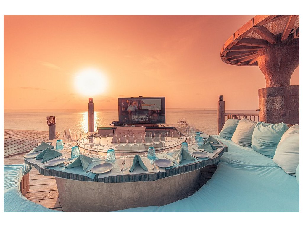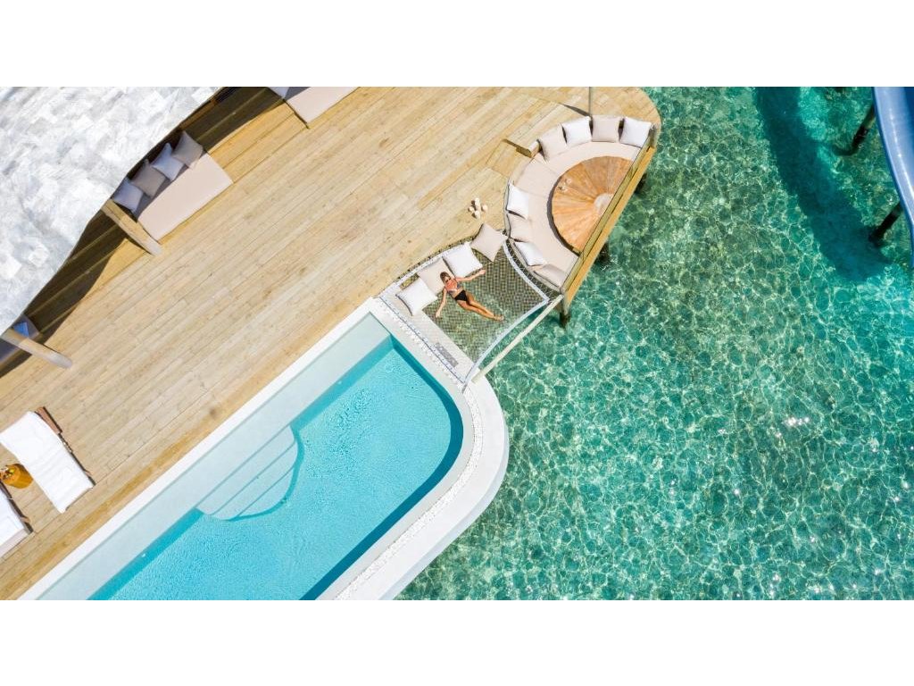 Impozantní vodní vila s maximálním soukromím, dechberoucím výhledem na oceán a skluzavkou přímo do moře. Nabízí prostornou terasu s bazénem, síťovaným lehátkem nad vodou, zapuštěným posezením a komfortními lehátky. Interiér s prosklenými stěnami propojuje vilu s okolní krajinou, zatímco zatahovací střecha nad hlavní ložnicí umožňuje pozorování hvězd přímo z postele.