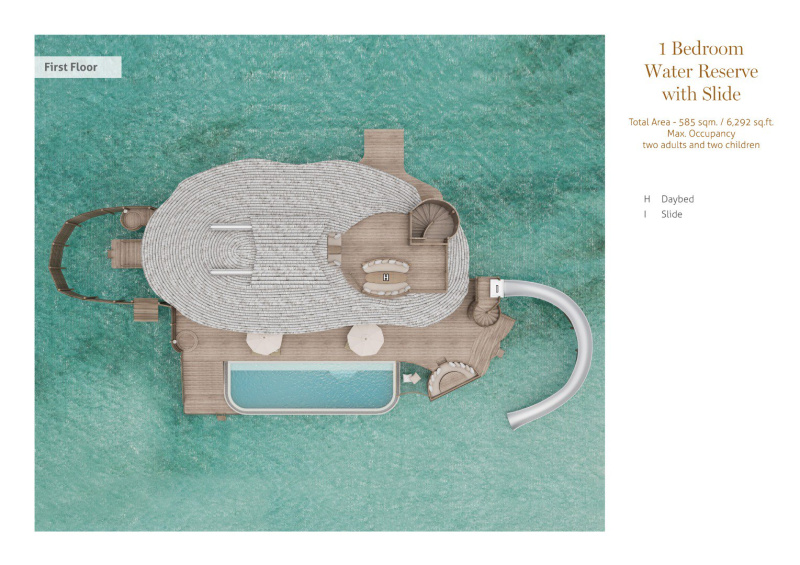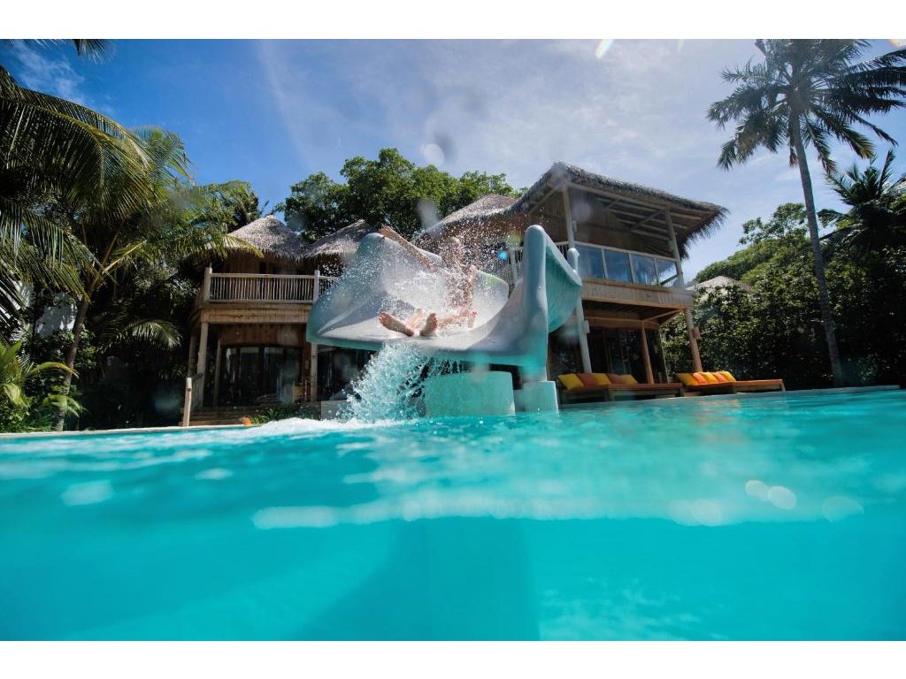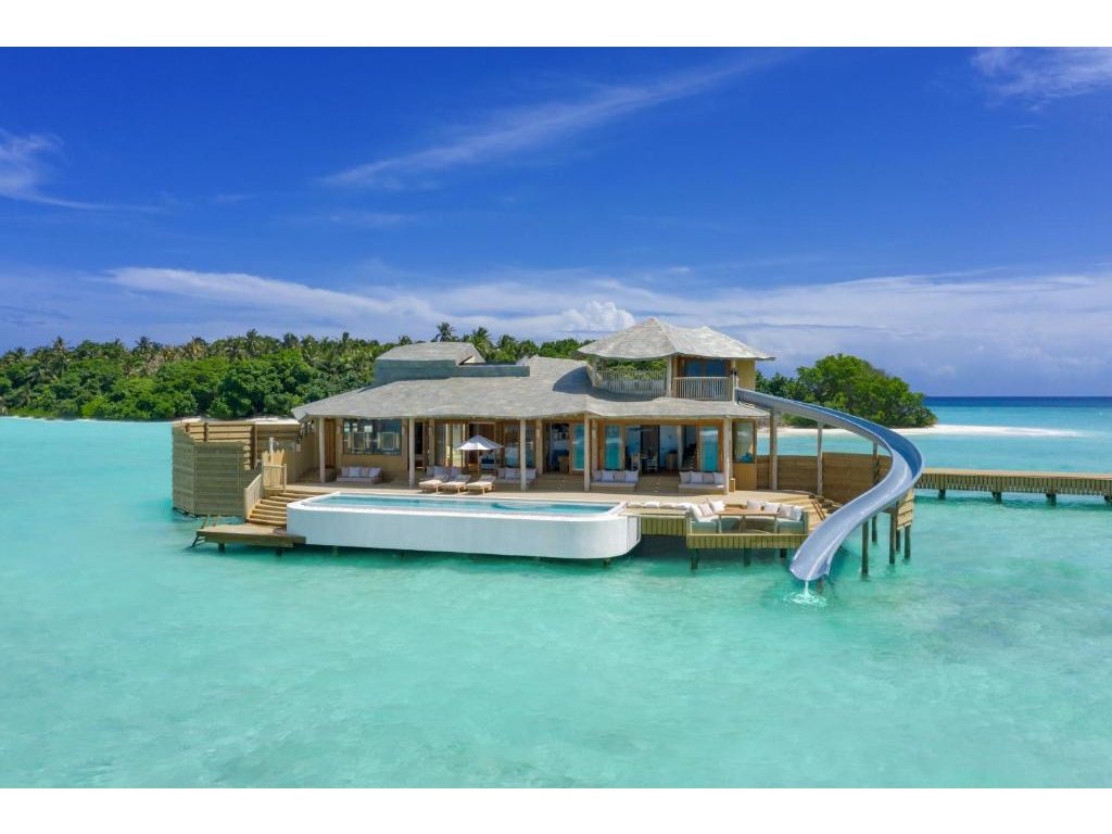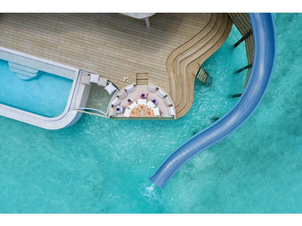 Luxusní vodní vila se skluzavkou, umístěná nad oceánem a přístupná po zakřiveném molu. Nabízí dechberoucí výhledy, prostorný interiér s přirozeným světlem, obývací část, minibar a spižírnu. Stylový interiér v přírodním tónu podtrhuje atmosféru absolutního klidu a soukromí.