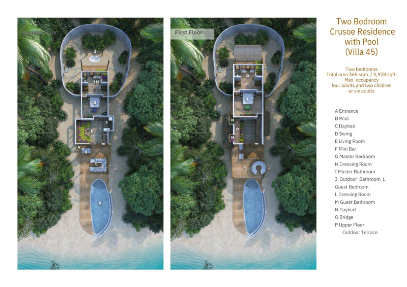 Kompaktní dvoupodlažní vila s privátním bazénem, rustikálně-elegantním interiérem a terasami zasazenými mezi tropické stromy. Jen pár kroků od pláže a tyrkysové laguny, ideální pro klidný únik a „castaway“ atmosféru v maledivském stylu.