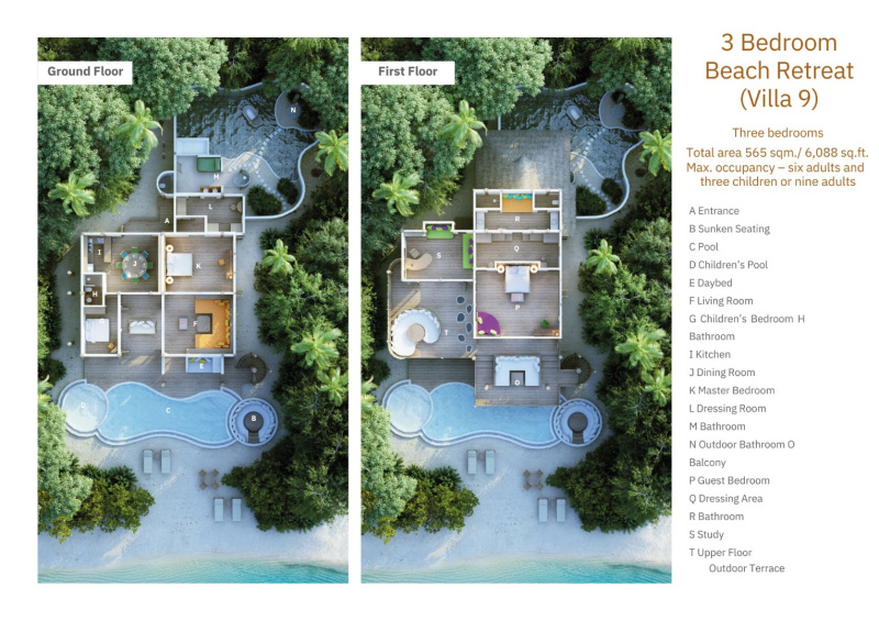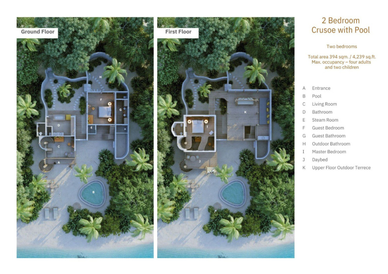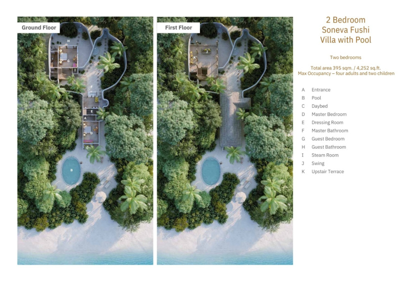 Plážová rezidence obklopená tropickou zelení s vlastním bazénem, venkovní sprchou a vířivou vanou pod širým nebem. Dvě ložnice (jedna v přízemí, druhá v patře), dvoupodlažní obývací prostor, knihovna, sluneční terasa a denní postele ukryté ve stínu vytvářejí ideální útočiště pro rodiny. Každá vila je unikátní a může se lišit uspořádáním a designem.