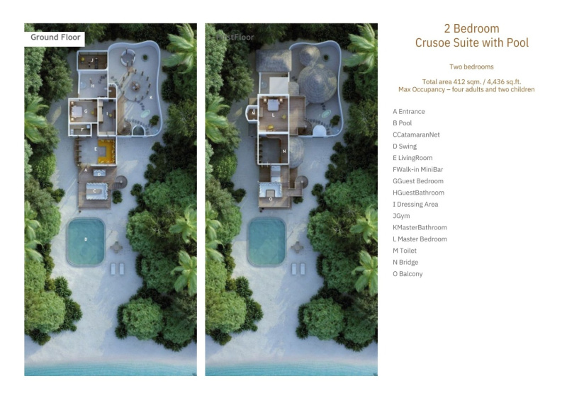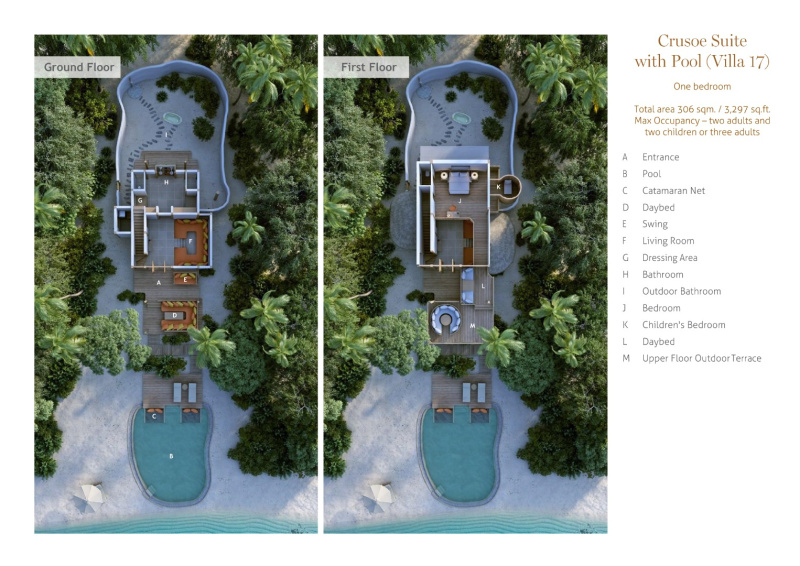 Dvoupodlažní plážová rezidence rozdělená do dvou samostatných budov. Nabízí soukromý bazén s catamaran sítí a zapuštěným posezením, směřující přímo k pláži. V přízemí se nachází obývací část s otočnými prosklenými dveřmi, ve tvaru U umístěná denní lůžka, plně vybavená spižírna, minibar a samostatná toaleta. V patře najdete knihovnu a lávku vedoucí na prostornou sluneční terasu s venkovní jídelnou. Ideální pro rodiny či páry hledající soukromí a klid.