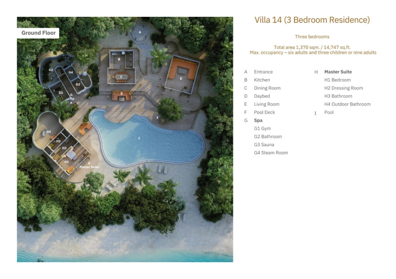 Rozsáhlá dvoupodlažní rezidence na pláži, zasazená do tropické zeleně a vytvořená v harmonii s přírodou. Nabízí elegantní interiéry, ručně vyráběný nábytek, vodní prvky, vodopádky, centrální terasu s herními prvky (ping-pong, stolní fotbal), soukromou posilovnu a relaxační zóny s lehátky. K dispozici je také wellness pavilon, venkovní jídelna, skluzavka do velkého sladkovodního bazénu a dětské brouzdaliště. Perfektní volba pro větší skupiny či rodiny hledající styl, prostor a zábavu.