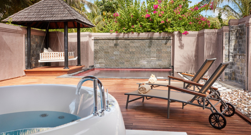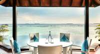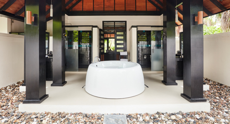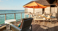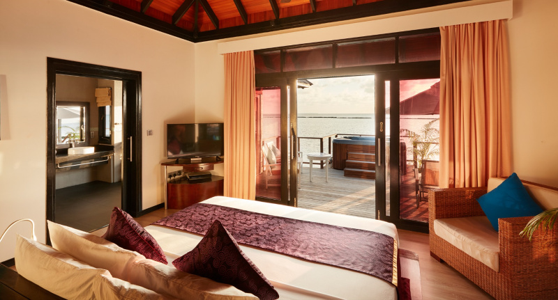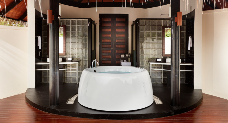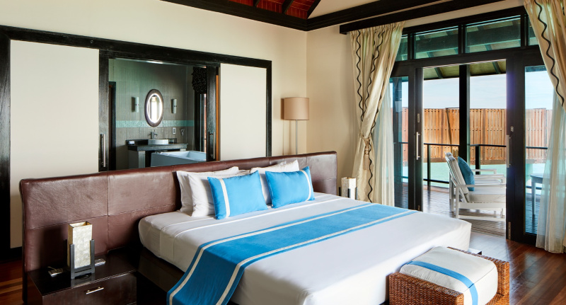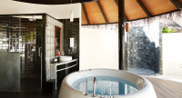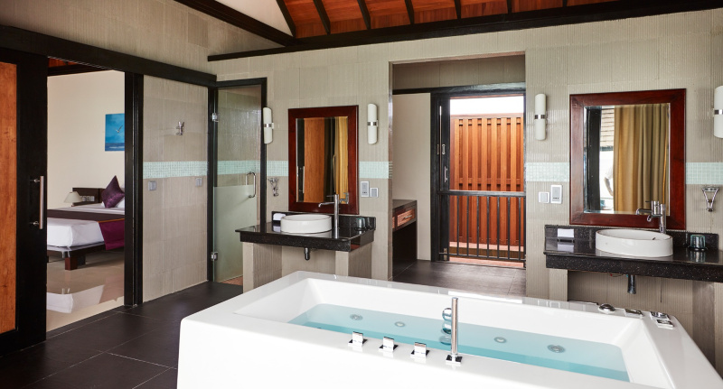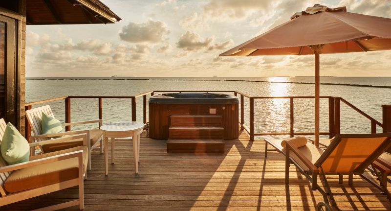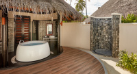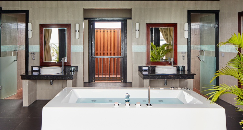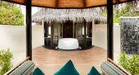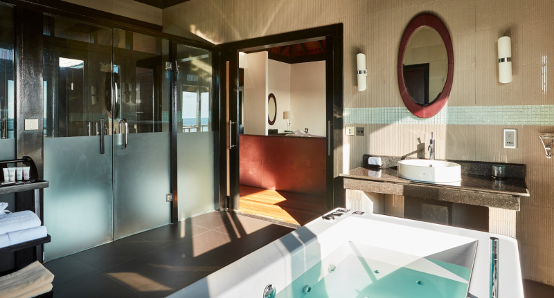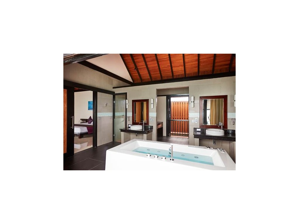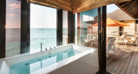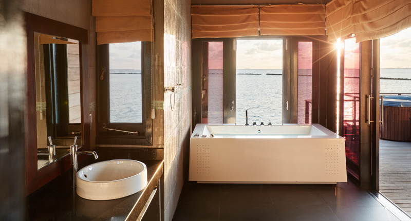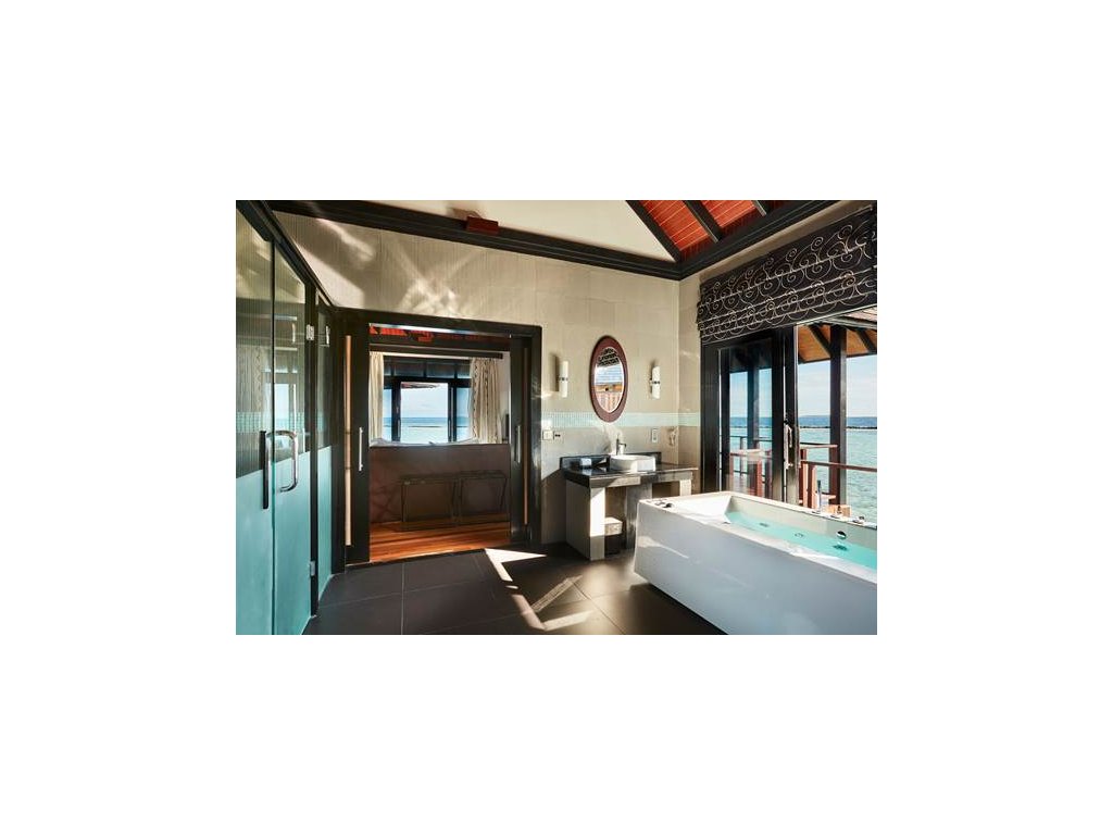 85 m², nadvodní vila s přímým vstupem do laguny, venkovní terasa s lehátky, elegantní koupelna s vanou s výhledem na oceán.