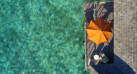 90 m², nadvodní vila s venkovní vířivkou, proskleným panelem v podlaze a schody do laguny. Až pro 3 dospělé + 1 dítě nebo 2 dospělé + 2 děti.