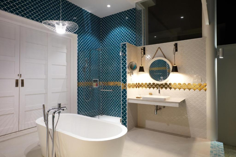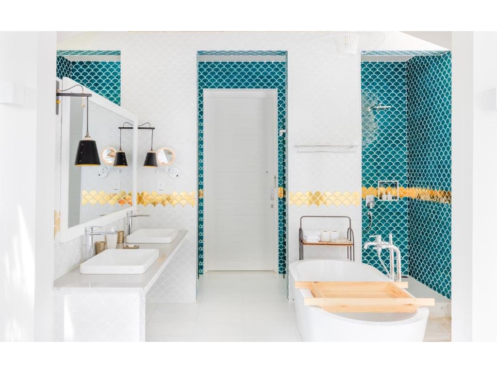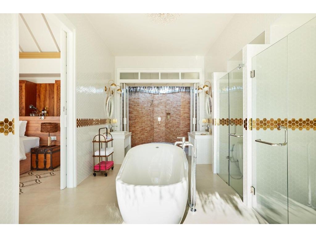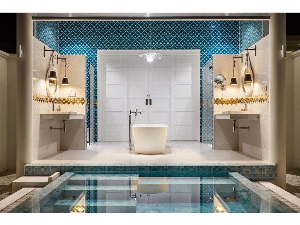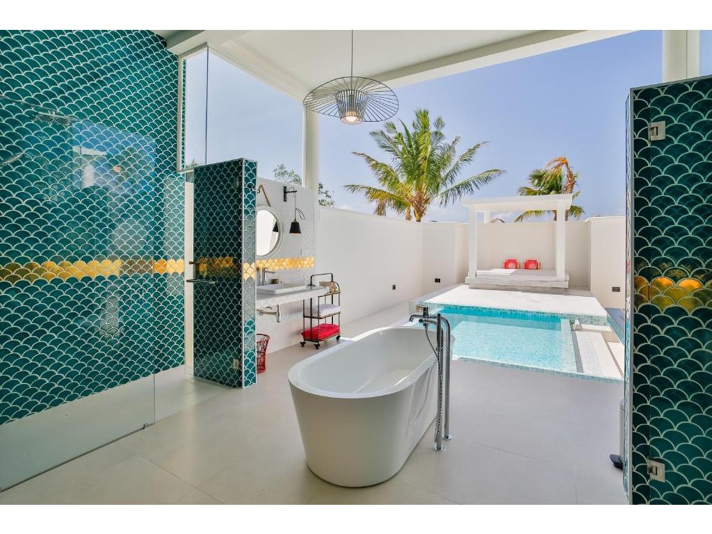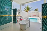Prostorná vila s výhledem na pláž, velkým bazénem, venkovním posezením a luxusní koupelnou pod širým nebem.