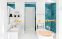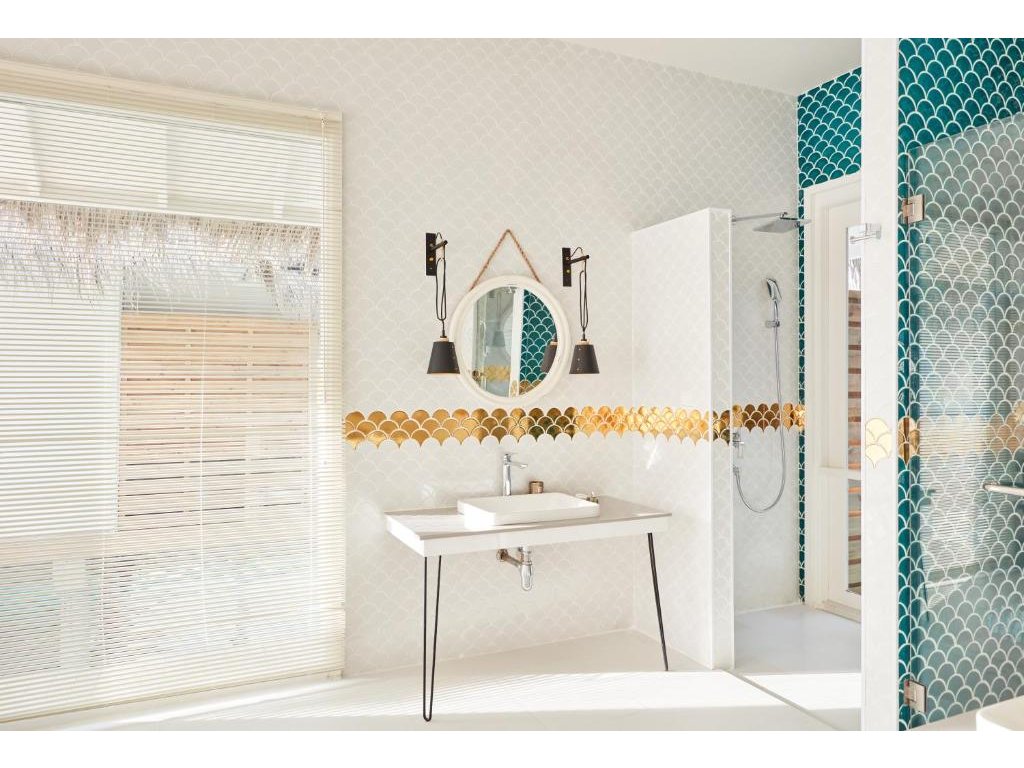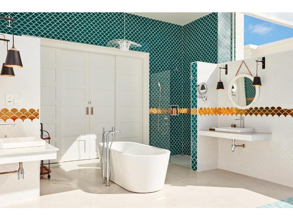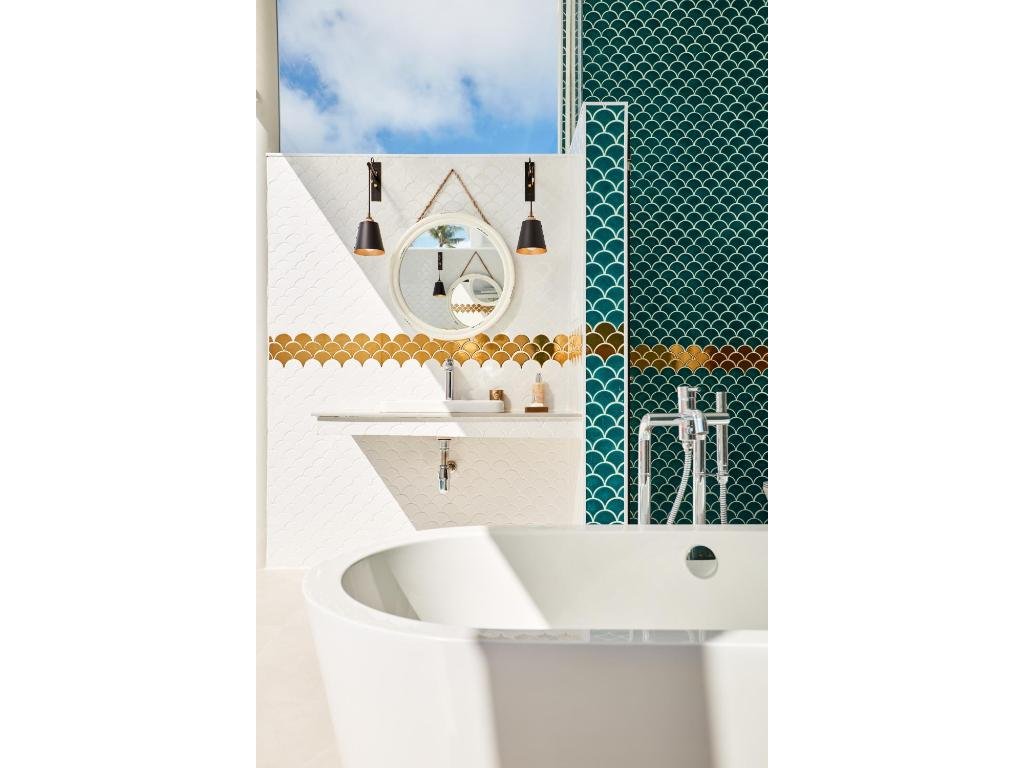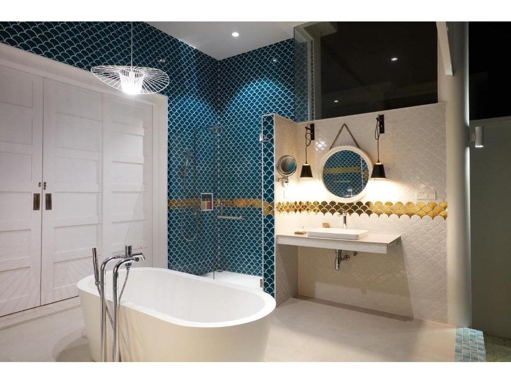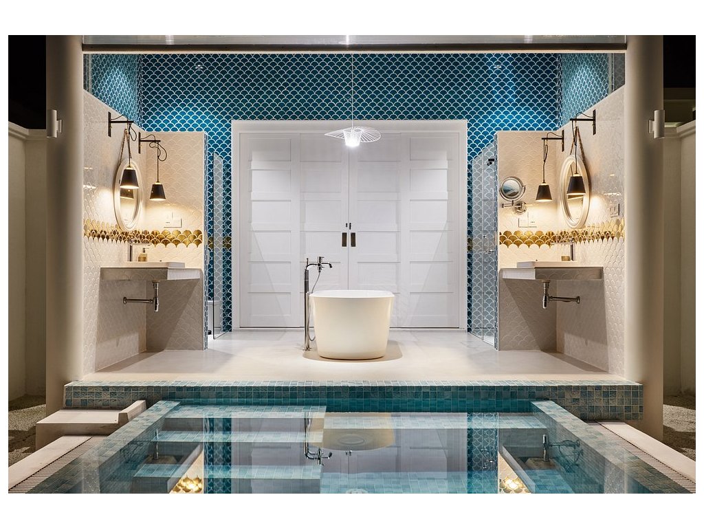 Prostorná vila s výhledem na pláž, velkým bazénem, venkovním posezením a luxusní koupelnou pod širým nebem.