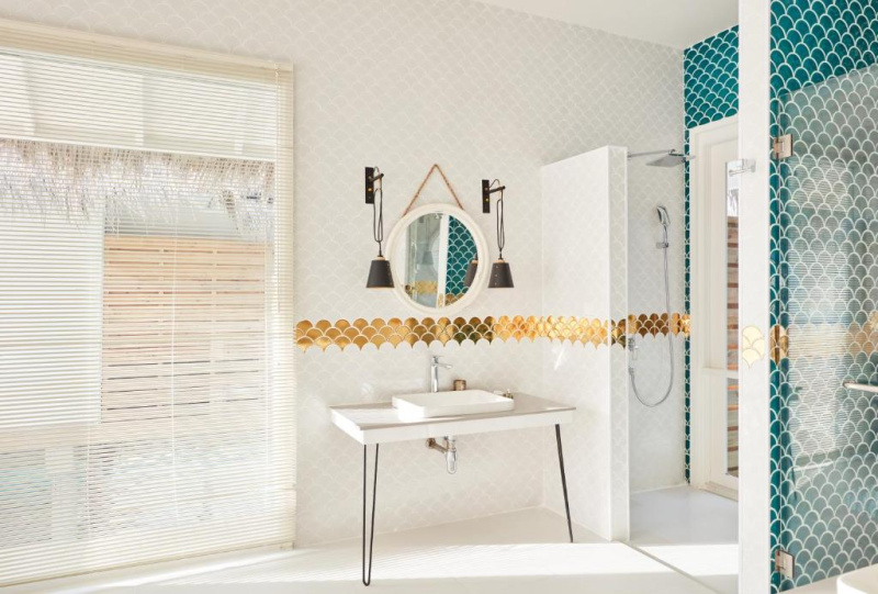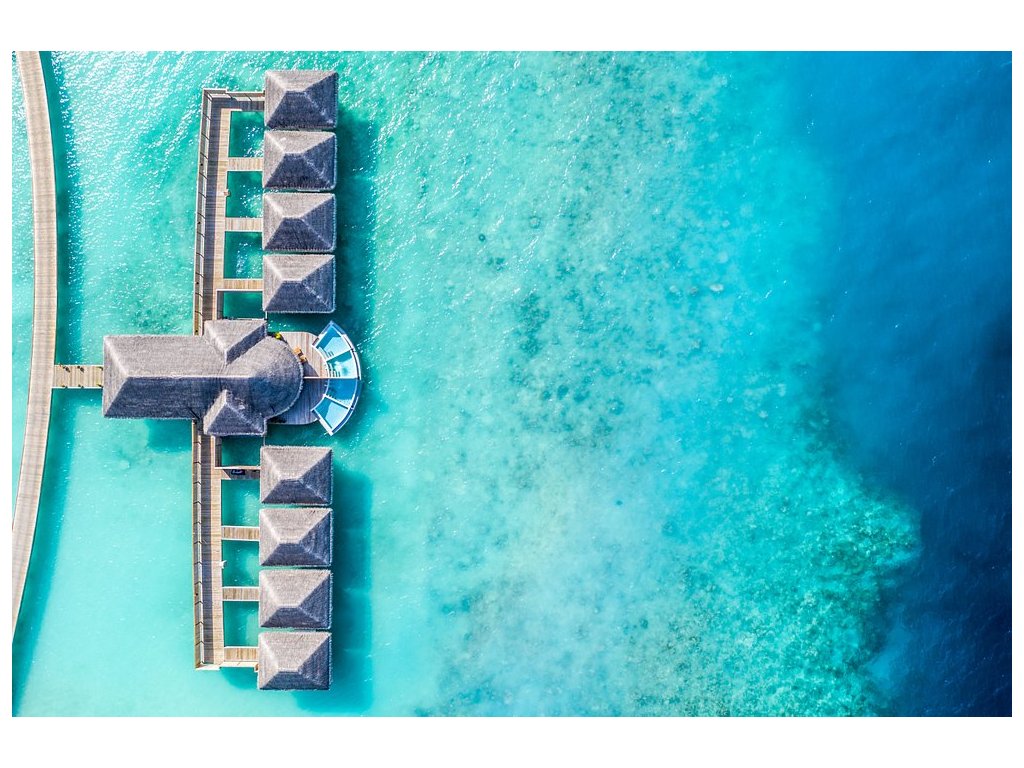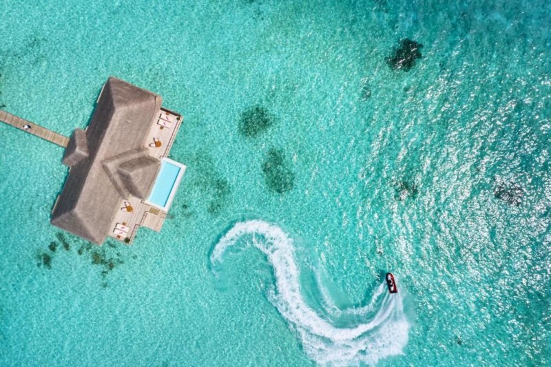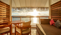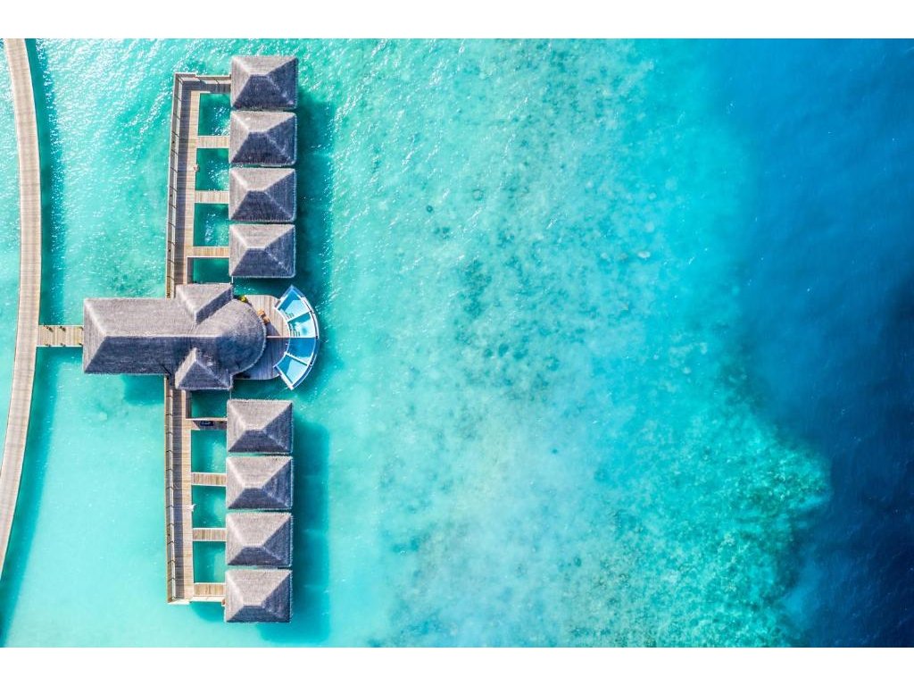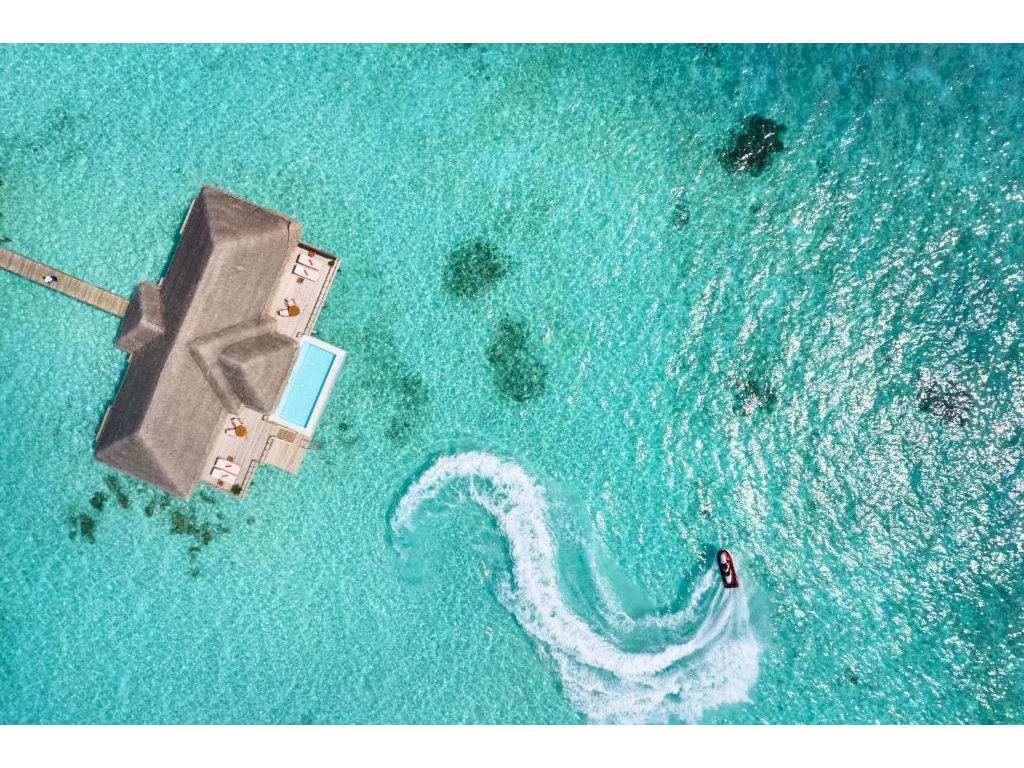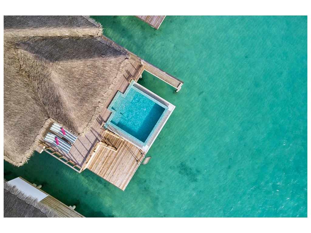 Nadvodní vila s prosklenou podlahou, soukromým bazénem a terasou s přímým vstupem do laguny.