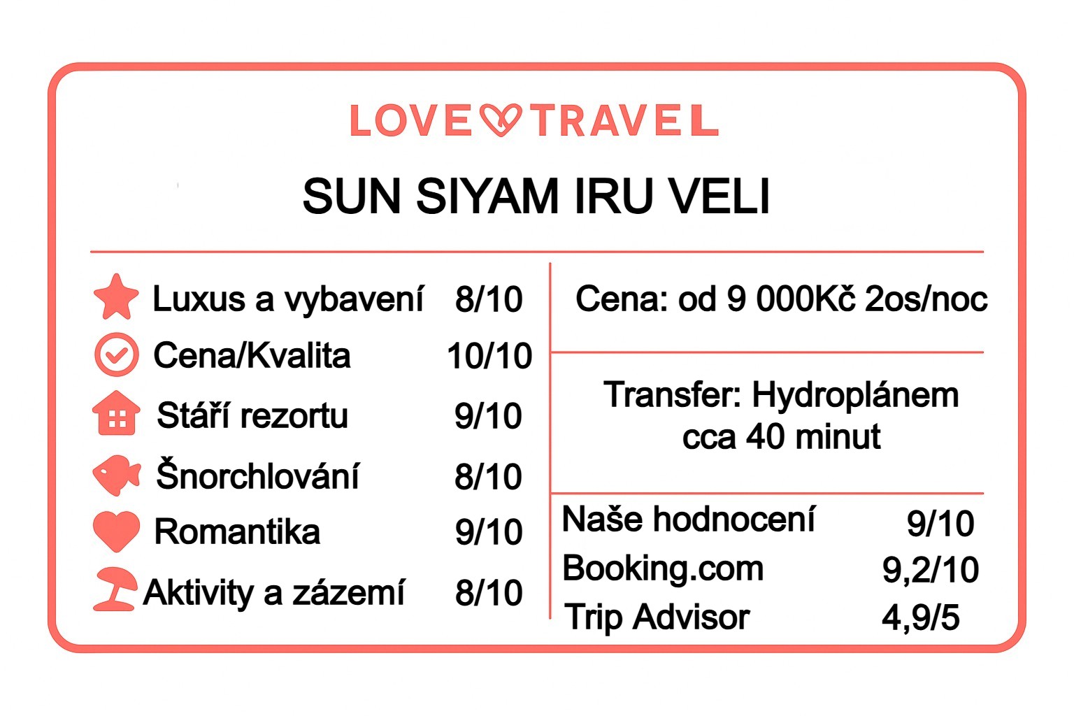 Sun Siyam Iru Veli je resort, který nabízí maximální komfort a zahrnuje mnoho aktivit bez příplatku při All Inclusive. Oproti jiným resortům v této cenové kategorii má výhodu v tom, že všechny vily mají vlastní bazén a all-inclusive zahrnuje i prémiové služby, které jinde bývají za příplatek.