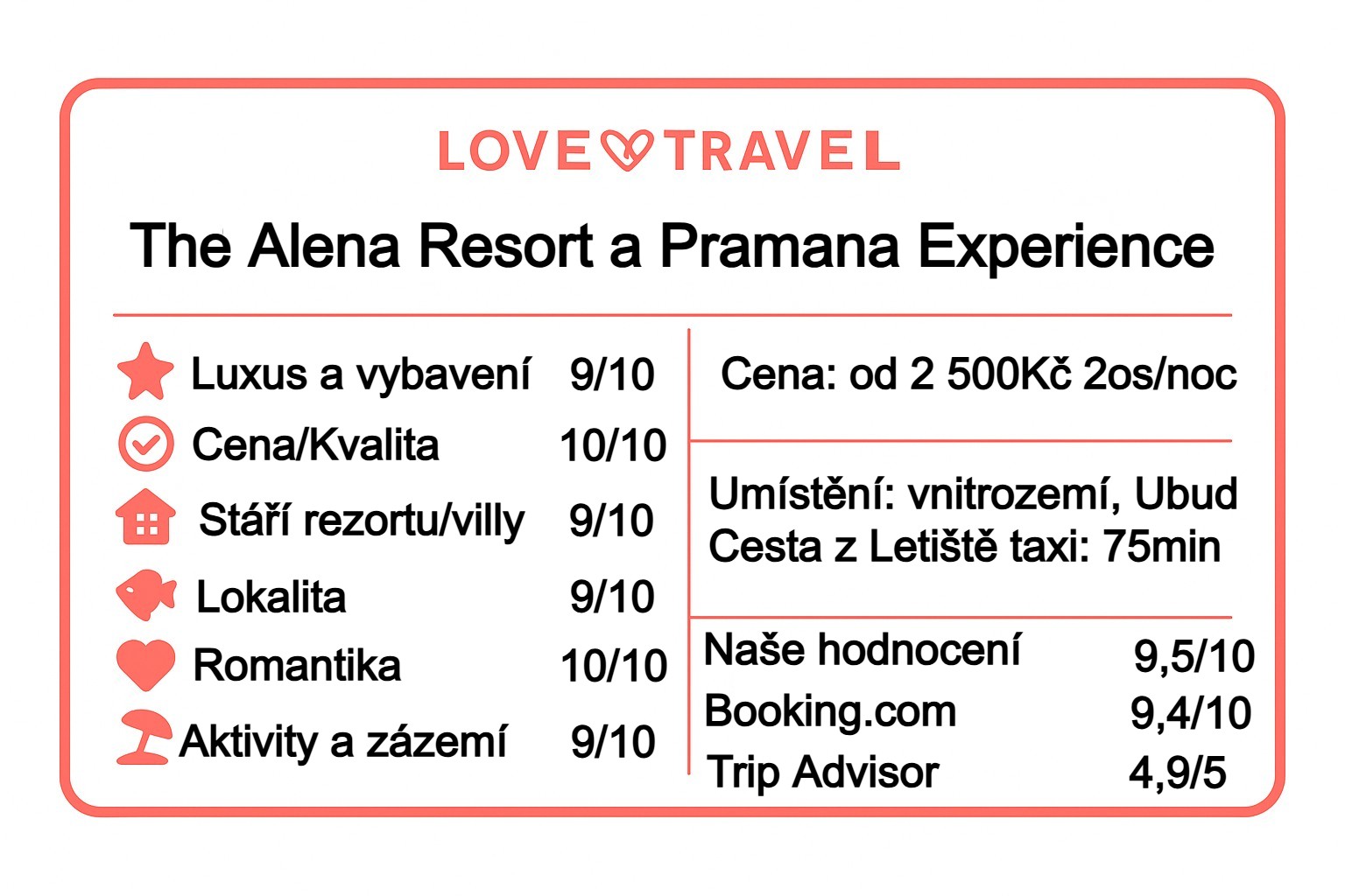 - Poměr cena/výkon: velmi dobrý u pokojů a suit; vily nabízí nadstandardní soukromí a prostor za adekvátní příplatek (silná sezónnost).