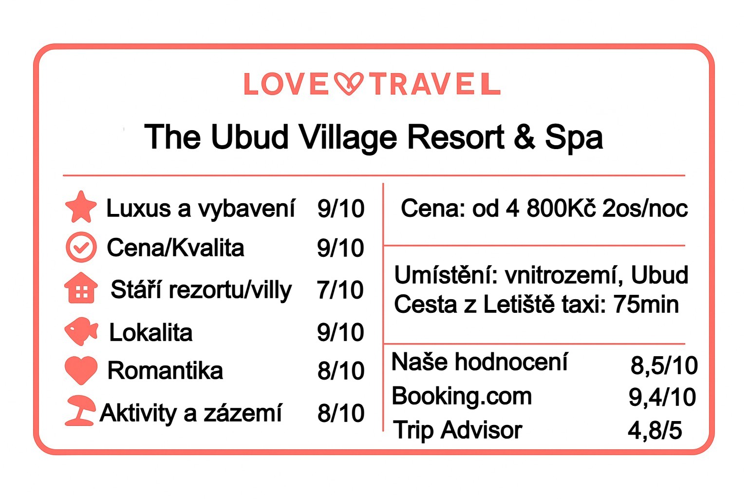 The Ubud Village Resort & Spa je zahradní oáza s velkými soukromými vilami kousek od Monkey Forest. Oproti plážovým resortům nenabízí moře, ale vynahrazuje to velkým prostorem, soukromím a kulturou Ubudu. Výborná volba pro romantický a klidný pobyt se snadným dosahem restaurací a atrakcí.