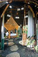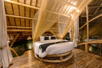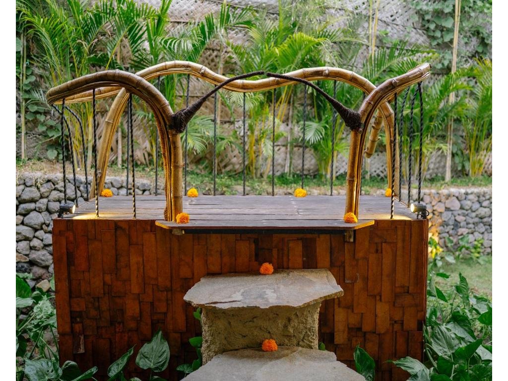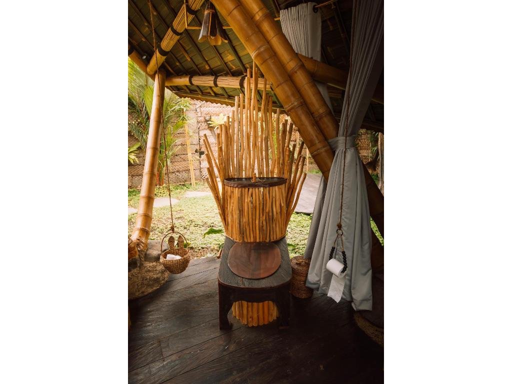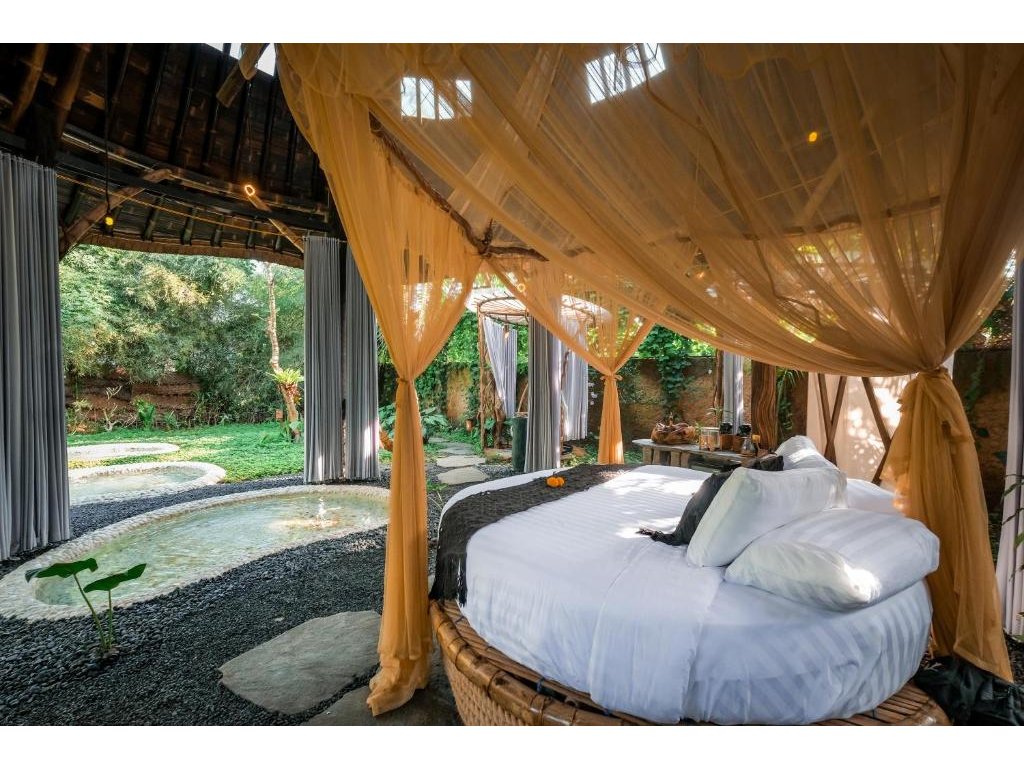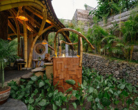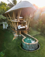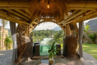 Bambusové vily s otevřenější dispozicí, privátní plunge bazének nebo venkovní vana u vybraných jednotek, ložnice s king bed, terasy s lehátky a vyhlídkou do údolí. Wi-Fi, moskytiéry, ventilátory / A/C dle vily. Možnost floating breakfast, dekorací a privátních set-upů.