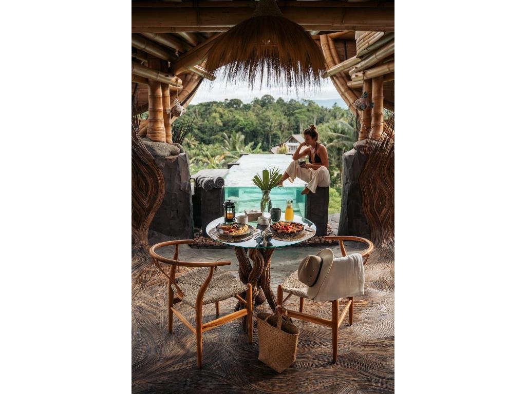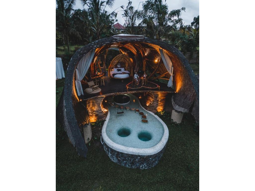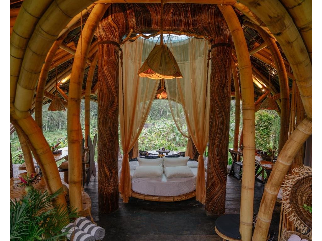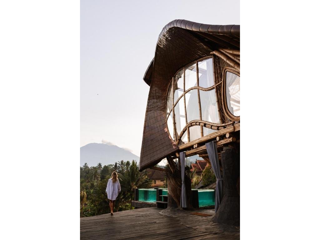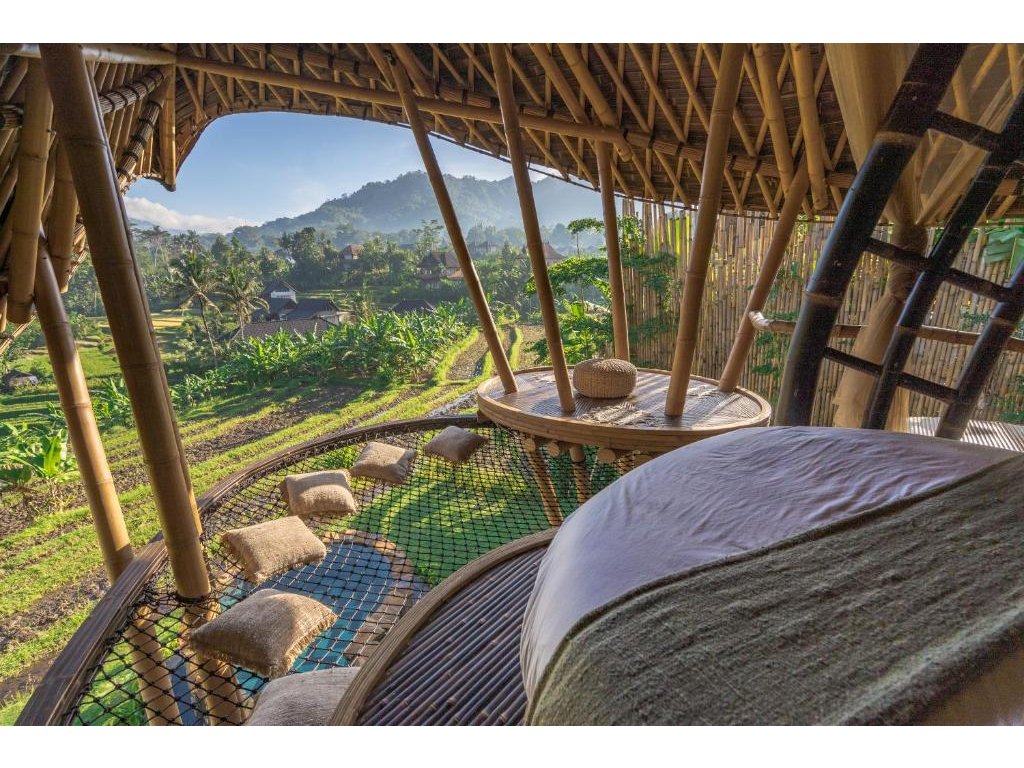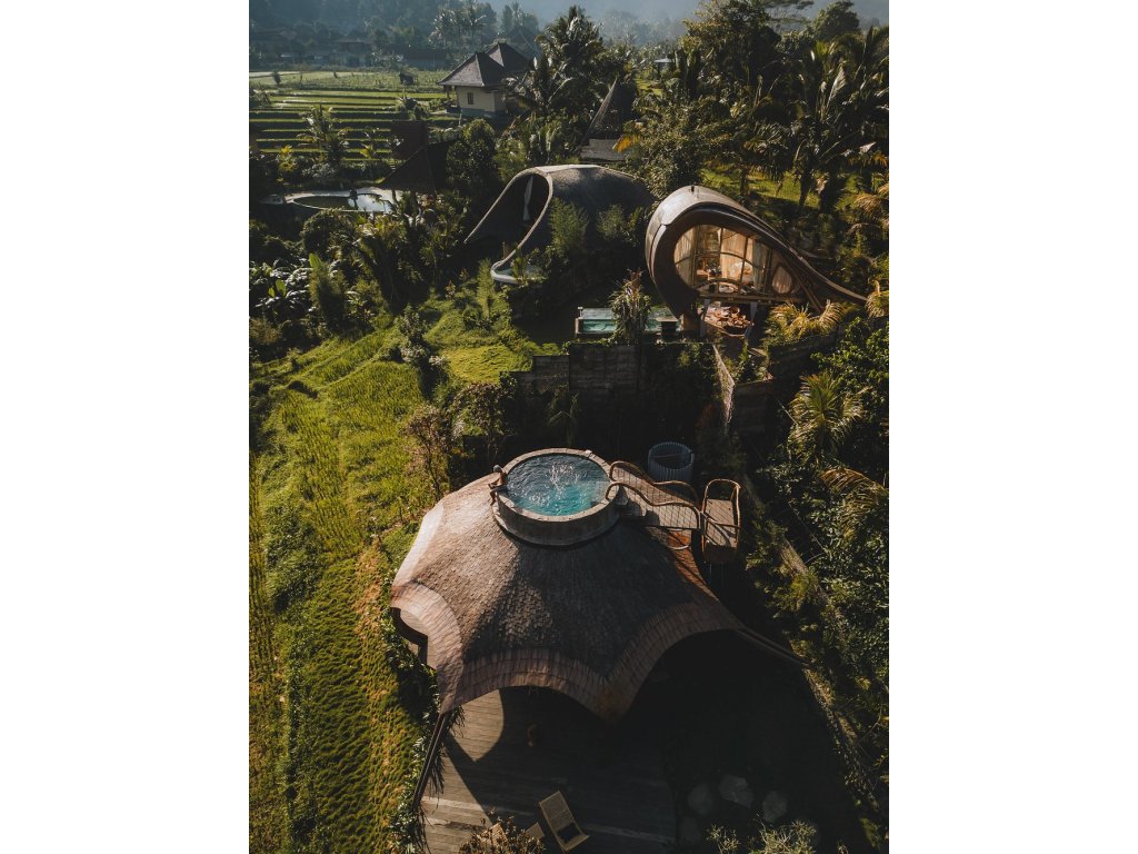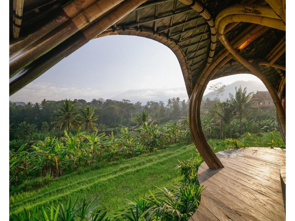 Ikonické bambusové vily ve Sidemen Valley (Východní Bali) s výhledy na rýžová pole a masiv Mt. Agung. Originální organická architektura (sovy, kobry, chobotnice aj.), soukromé plunge bazénky či vany pod širým nebem u vybraných vil a intimní „hideaway“ atmosféra. Ideální pro páry, honeymoon a milovníky přírody a fotogenických zážitků.