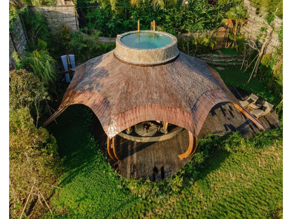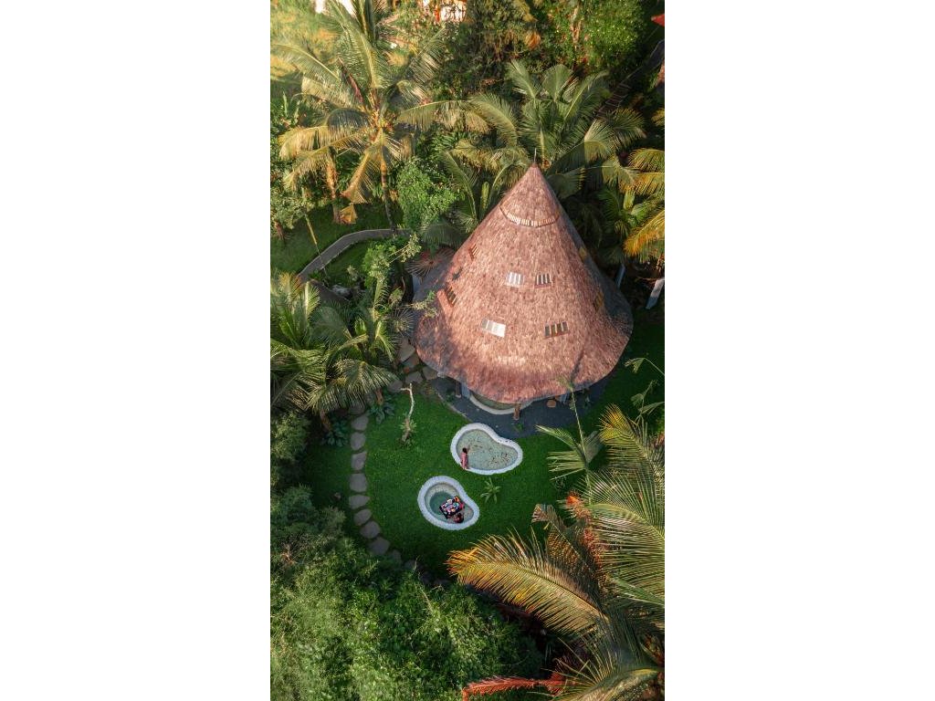 cca 100 m² | Dvoupatrová bambusová vila s ikonickým „sovím“ designem, terasa s posezením, otevřený obývací kout, ložnice s king bed, koupelna (často s venkovní částí). Výhledy na rýžová pole / Agung. Intimní atmosféra pro páry.
