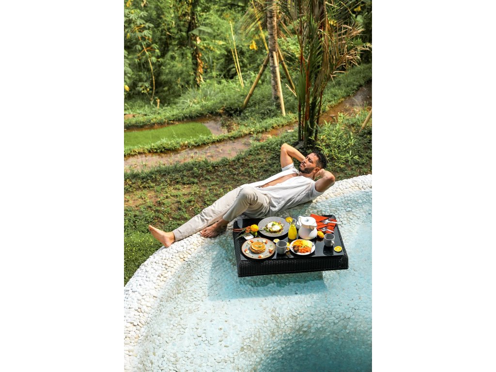 Snídaně à la carte servírované do vily; výběr mezinárodních i lokálních jídel. Večeře formou in-villa dining / dovoz z okolních podniků; možnost speciálních romantických set-upů na terase.