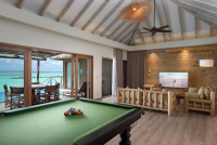 Větší vodní vila s odděleným obývacím prostorem a terasou s lehátky. Výhled na lagunu a oceán. Skvělá volba pro delší pobyty. Cena včetně snídaně. 65 m²