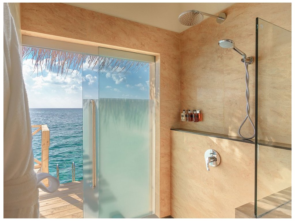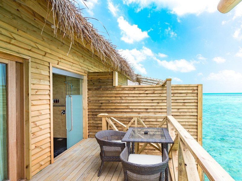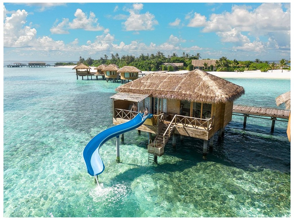Vodní vila s vlastním skluzavkou z terasy přímo do oceánu. Moderní design, prostorná terasa, otevřený interiér. Ideální volba pro páry hledající netradiční zážitek. Cena včetně snídaně. 65 m²