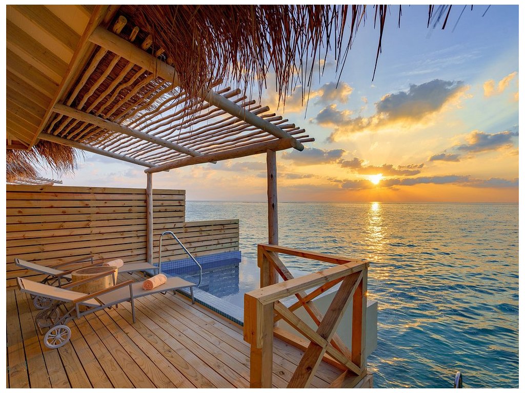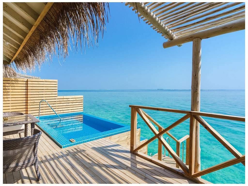 Luxusní vodní vila s privátním bazénem, prostornou terasou a nádherným výhledem na oceán. Přímý vstup do vody, maximální komfort. Cena včetně snídaně. 80 m²